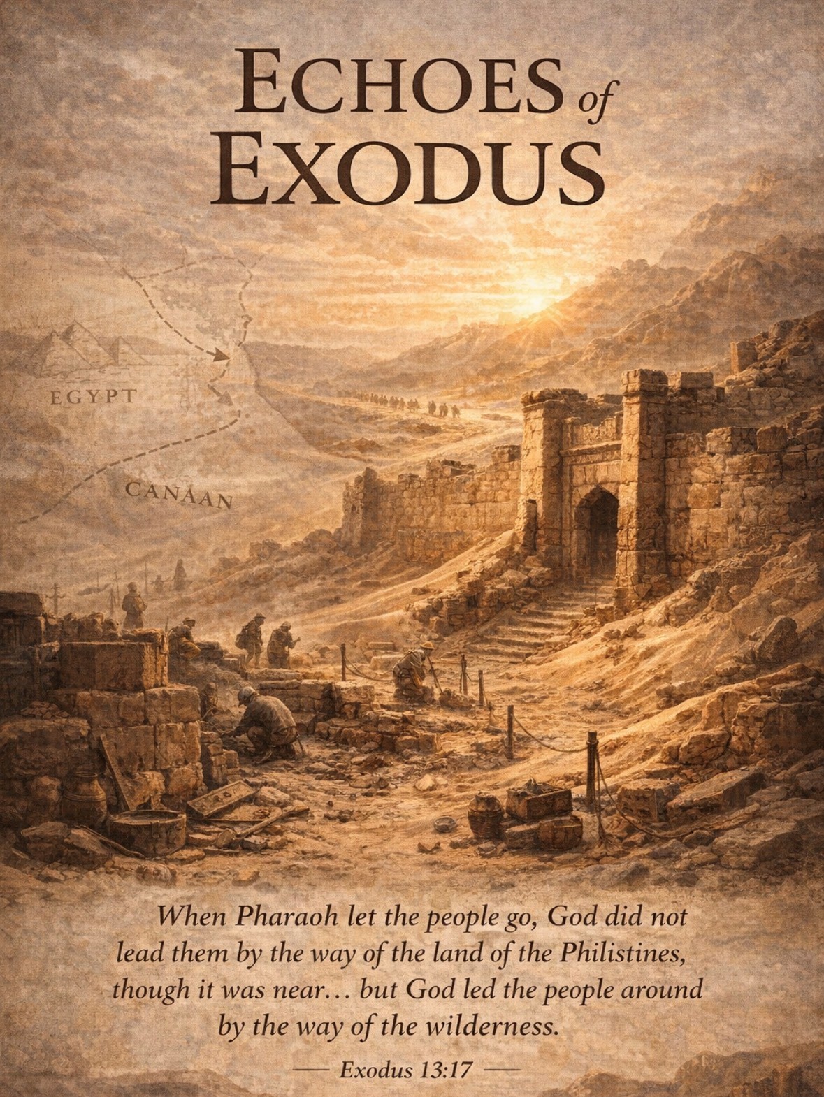 So, what of the difficult and challenging task that lay ahead for the Israelite’s, i e. forty years in the wilderness?  Well, the Sinai Desert is described as “24,000 sq. miles of nothing.”  And archaeologists have not yet discovered evidence of the Israelites there, as nomadic people are described as “archaeologically invisible.”  Even the exact route they took to escape from the Egyptians is unknown.  But recently (2025) archaeologists uncovered a 3,000 yr. old Egyptian fortress along the route tied to the Exodus.  The shorter route which led from Egypt to Canaan was the Horus Military Road where the fortress was found.  But God did not lead them on the road through the Phillistine country, though that was shorter, for God said if they faced war, they might change their minds and return to Egypt.  So, God led His people around by the desert route toward the Red. (Exodus 13:17)